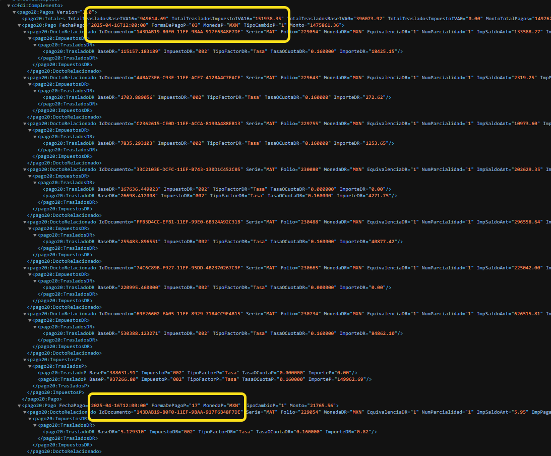 Validación en XML, deben de venir 2 secciones una con forma de pago "03" ( o la seleccionada en forma de pago) y la otra con "17" que corresponde a las comisiones
